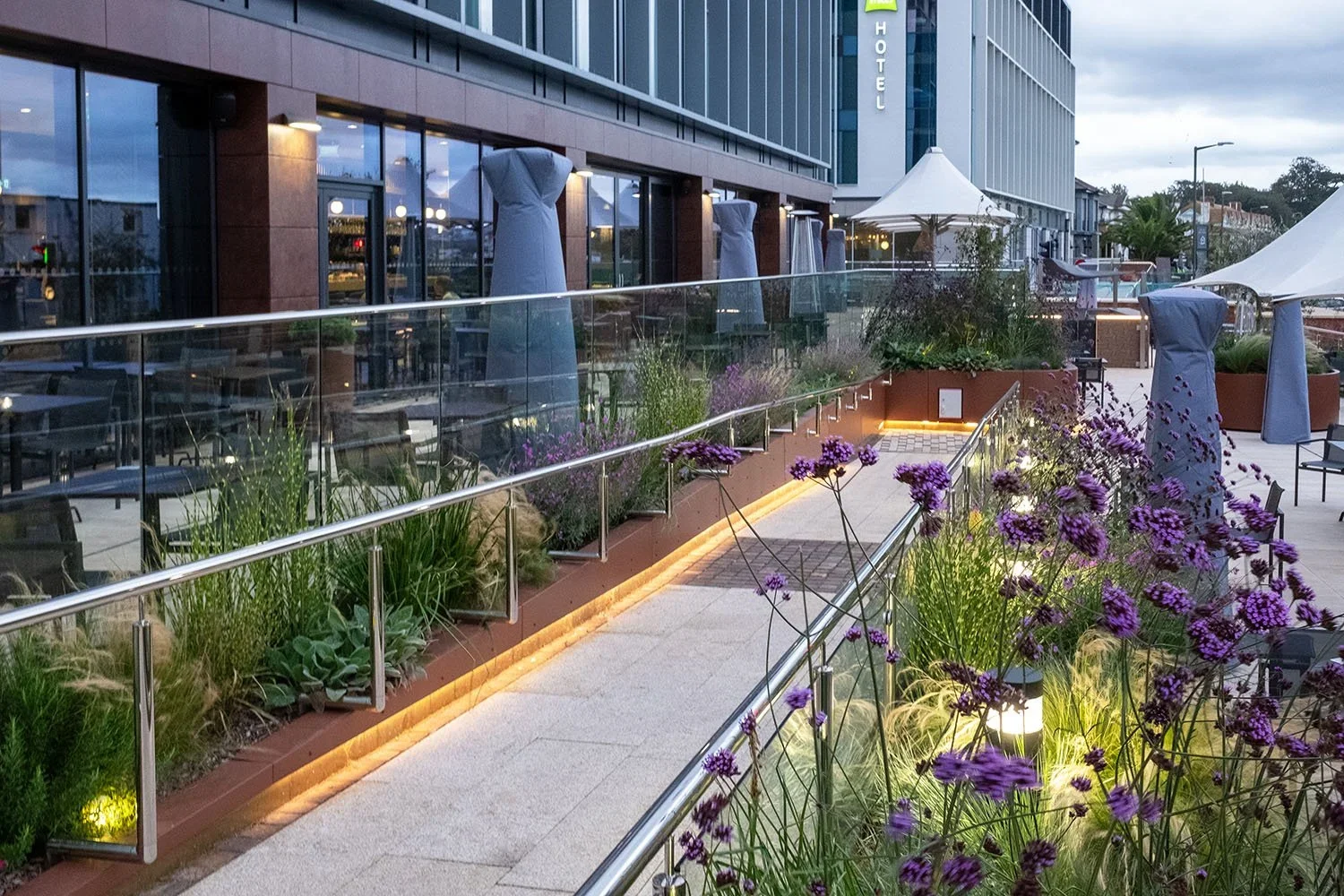 These images, captured shortly after completion, showcase a beautiful blend of textures and colours for the new Mercure Hotel in Paignton. The soft, low-level lighting along the entrance ramps and steps provides a warm welcome (with the help from IOTA to make this a reality), guiding guests seamlessly into the hotel lobby and enhancing the overall atmosphere of the space.